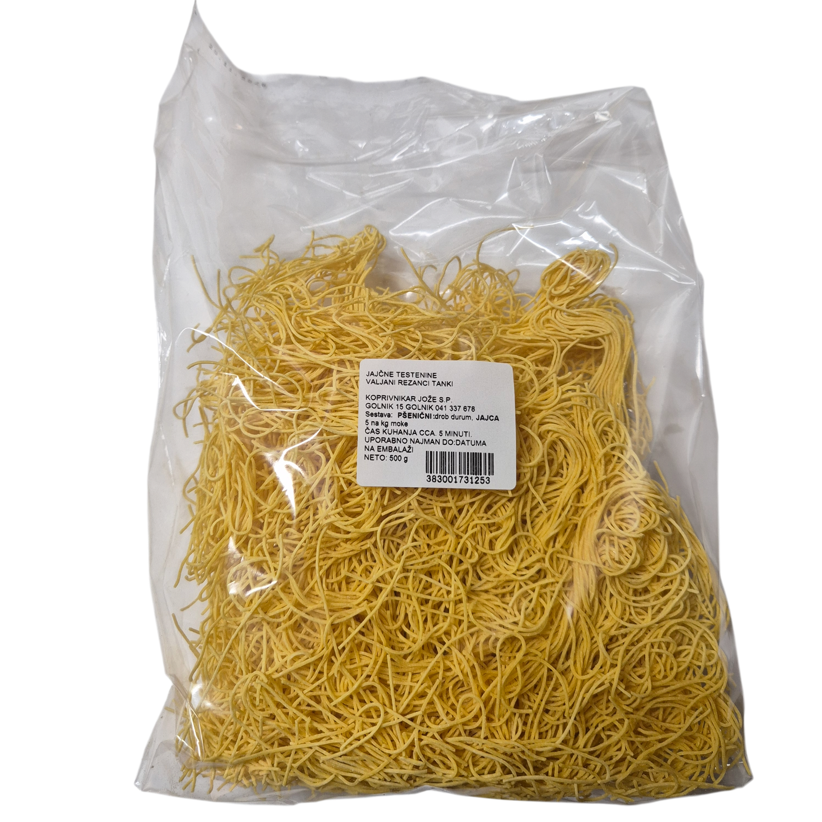 Ti tanki nudli so narejeni iz istih vrhunskih sestavin. Domača jajca z Golnika in najboljša durum moka, kar pomeni, da ponujajo tisto popolno razmerje med čvrstostjo in nežnostjo, ki ga pri jušnih testeninah iščeš zaman v industrijskih izdelkih.
